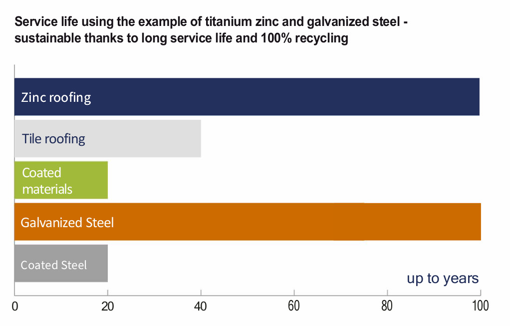 The environmental impact of zinc products for roofs and facades is presented transparently by the manufacturers. Standardized environmental product declarations according to EN 15804 provide the data for a CO2 footprint for building certification. Due to the comparatively low melting point of zinc, the long service life and Due to its 100% recyclability, zinc's CO2 footprint is comparatively low.